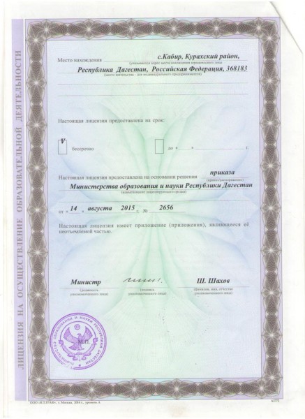 Адрес местонахождения образовательной организации* 368183. с.Кабир, Курахский район,РД
